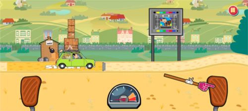 那辆憨豆先生所拥有的经典的绿色迷你车,是这款游戏的核心元素,在跑酷进程当中,玩家能够收集四处散落的金豆,进而积攒能量,当位于屏幕左上角的汽车图标被填满之后,朝着前面 direction进行屏幕滑动操作,这辆迷你车就会闪亮登场,使其进入一段高速驾驶的猛冲阶段 。
