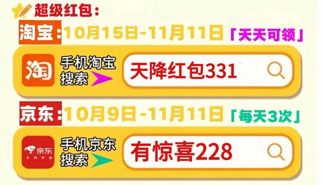 2025年双十一期间,淘宝平台推出了好些多种红包口令,消费者凭借搜索特定的数字组合,即可领取相应的红包,就像“有惊喜228”,每天能够领取三次,最高金额可达11111元,这些口令被划分成加码红包、全周期通用红包以及品类专属红包,用以满足不一样的购物需求 。