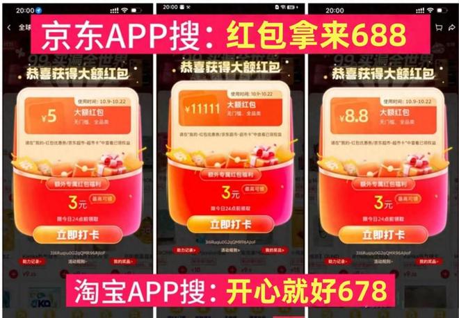 10月9日起京东红包开始发放,用户打开APP,搜索叫做“红包拿来688”的内容,便可领取,每天存在3次基础领取机会,晚上8点会额外增添1次,红包金额处于1.18元至11111元的范围,10月31日以及11月10日晚8点红包池会进行加码,大额红包中奖概率明显提高 。