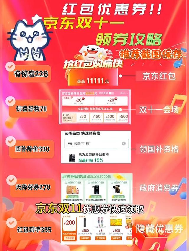 10月31日晚上8点,京东会发放“满5000减1000”的神券,叠加国家补贴后,5000元的家电套装实际支付可能低至3011元。11月10日晚上8点,全平台会有红包雨翻倍活动,京东的“11111元神券”和淘宝的“25888元超级红包”都会在这个时段集中释放。